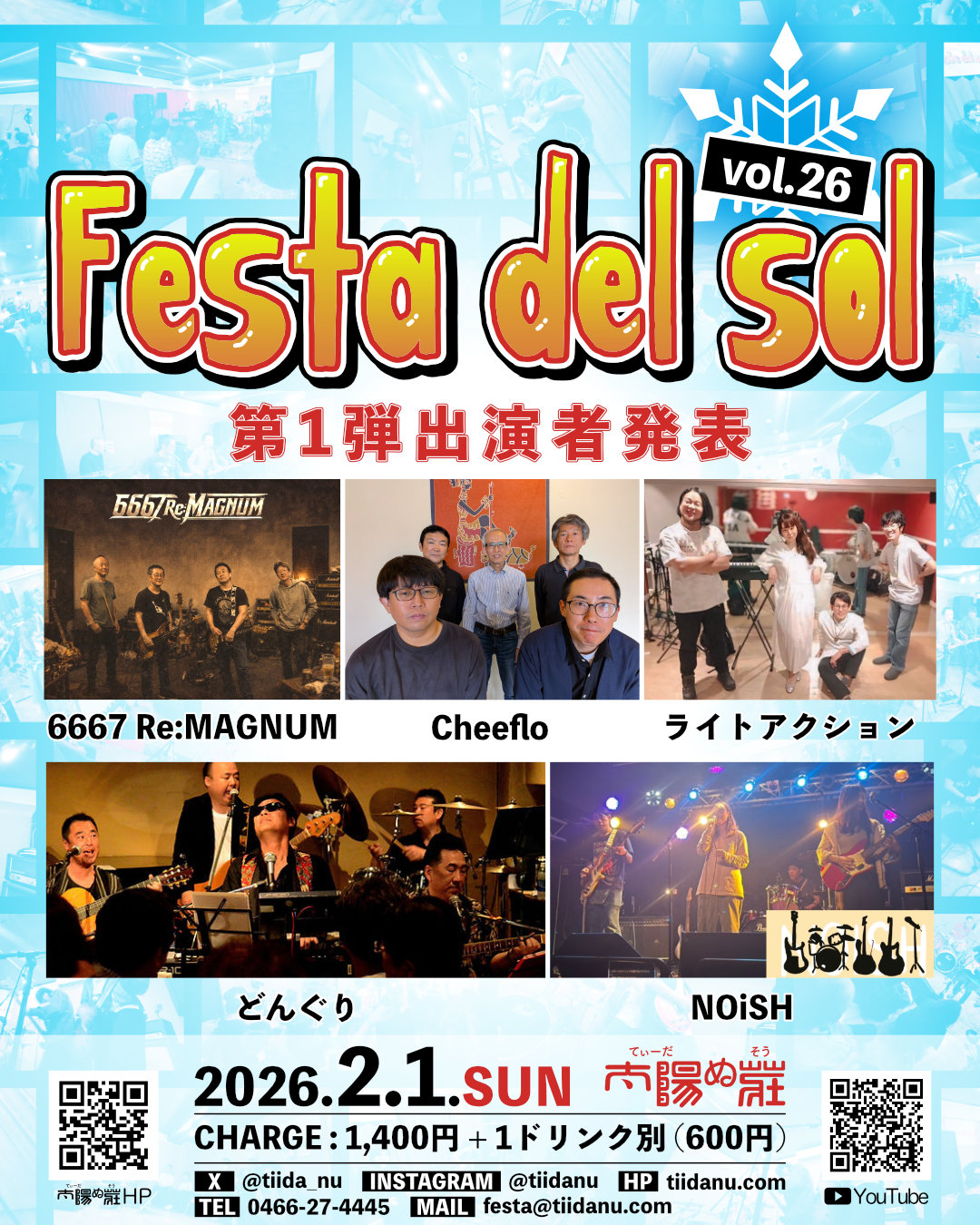 Festa del sol vol.26 出演者発表 2026年1月11日 tiidanu 2026年2月1日(日) Festa del sol vol.26 藤沢 太陽ぬ荘スタジオ 1,400円 +1ドリンク(600円) [出演] 6667 Re:MAGNUM Cheeflo ライトアクション どんぐり NOiSH 他